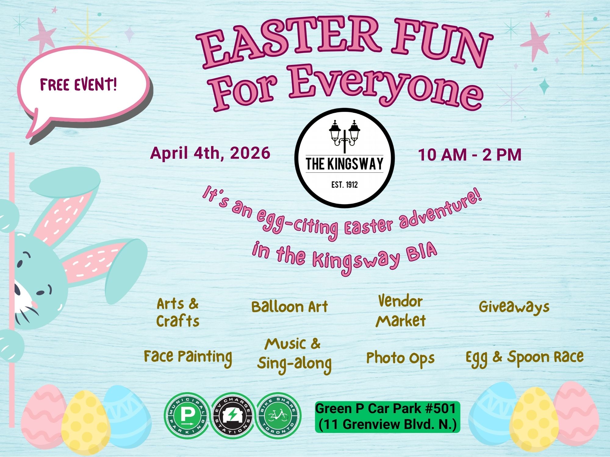 Join us for an egg-citing adventure with vendor market, face painter, music and sing-along, egg and spoon race, balloon artist and more.